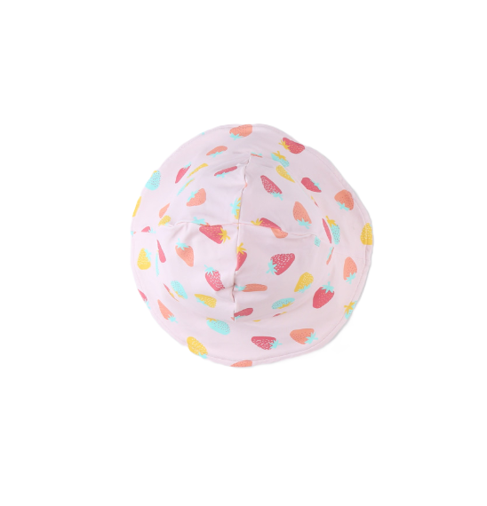 Réversible, il possède un côté rose clair avec un imprimé fraises et jaune et un côté rose clair uni