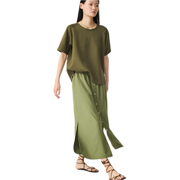 Angep est une jupe longue à petits boutons en résine sur le devant, elle est confectionnée en tissu extensible dans les 4 sens et à séchage rapide. La matière est fluide et chic. Ses détails incluent des poches fendues latérales, des fronces à la taille et des fentes hautes sur le côté.